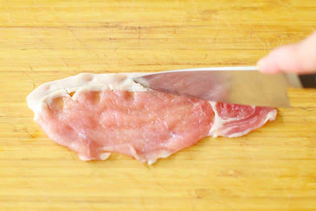 <その2>1枚ずつしっかりと筋切りをする。このひと手間で、焼いたときに肉が縮みにくくなる。