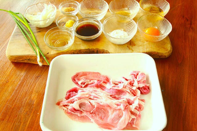 ①【下準備】豚肉はあらかじめ常温に戻して筋切りをし、片栗粉を振る。Aは合わせておく。
