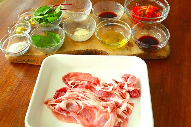 ①【下準備】豚肉はあらかじめ常温に戻して筋切りをし、片栗粉を振る。Aを合わせておく。バジルはちぎっておく。