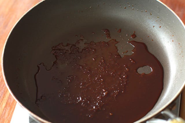 <その6>お肉に火が通ったらフライパンから取り出し、タレを煮詰めた後にお肉を戻し入れ絡める。この方法であればお肉に火が通りすぎて固くなることが少ない。