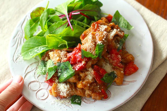 生姜焼きのタレにトマトを加え、パルメザンチーズとバジルを散らしたイタリアンな生姜焼き。甘辛ダレにトマトの酸味が良く合い、爽やかな香りのバジルとも相性抜群。より洋風な雰囲気を出すために、千切りキャベツではなくミックスグリーンを使用するのがおすすめ。