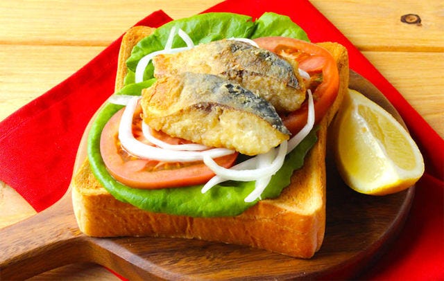 外はカリッ、中はふんわりジューシーに焼き上げたサバを大胆にトーストに乗せるだけの一品。「サバとパンって……」なんて不安は、ひと口食べれば一瞬で吹き飛ぶくらいにおいしい。ひと口かじるとサバのうまみが口いっぱいに広がり、こんがり焼き上げたパンとの相性も◎。サバの脂によく合うレモンをたっぷりかけていただくのがおすすめ。