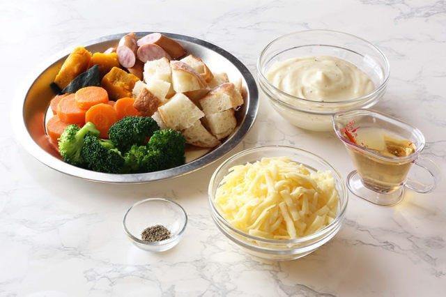 チーズフォンデュもホワイトソースを使えばいつもよりもクリーミーに仕上がる。また、ホワイトソースで作ることで冷めても固まりにくくなるので、パーティーやワインのお供にぴったり! お子様といっしょに食べる場合は、材料の白ワインを牛乳に変えれば甘みが加わって食べやすくなるのでオススメ。