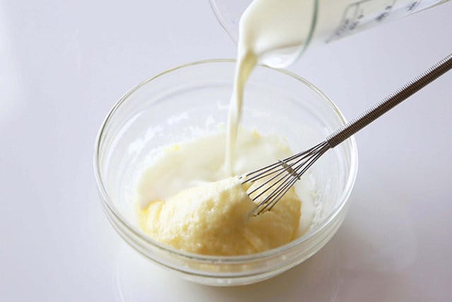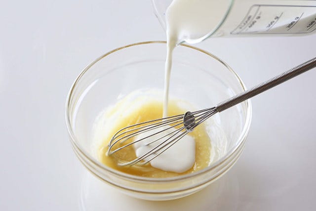 ③ よく練り混ぜ、残りの牛乳を加え、更に600Wで2分加熱する。