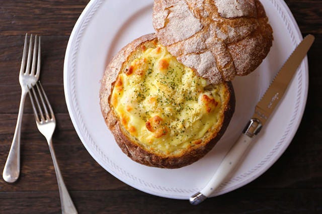 1.こんがり焼いた丸パンの中にはとろ~り濃厚なエビグラタン。「ホワイトクリームグラタン」