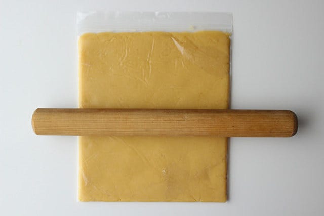 ③ ジッパー付きポリ袋に入れ、厚さ3ミリに伸ばす。オーブンを170度に余熱している間に”冷凍庫”で生地を冷やす。