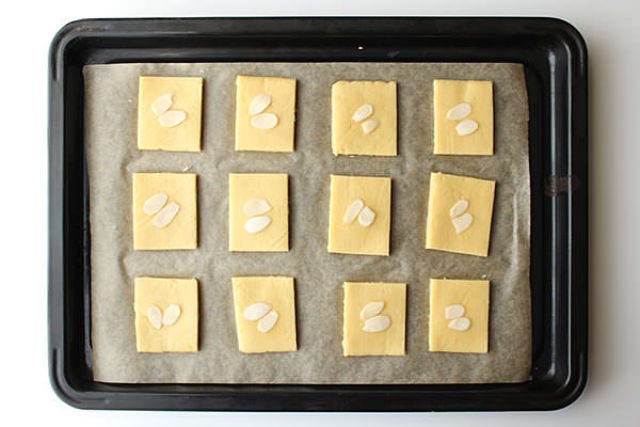 ④ 余熱が完了したら、袋を切って生地を取りだし、12等分に包丁で切って天板に並べる。アーモンドスライスを飾って10~15分間焼く。