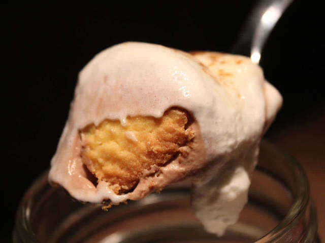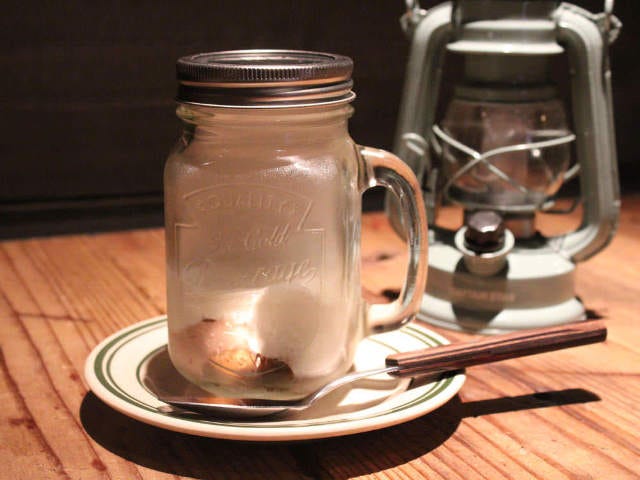 底からスプーンですくうと、バタークッキーに絡んだチョコレートクリーム、そして白くて甘いクリームが。実はこれは、自家製のマシュマロクリーム。ゼラチンの配合比率を変え、とろっと絡むようなやわらかさになっている。口に含むと、バタークッキーにチョコにマシュマロという組み合わせはぴったり。スモークの香ばしい香りが、甘みにいいアクセントとなっている。やっぱりキャンプファイヤーには焼きマシュマロがないと〆られない!