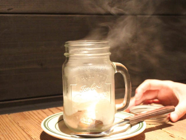 ガラスコップの中に、白い煙が充満している。この煙の正体はなんだろうか。蓋をあけると、想像以上に大量のスモークの香りをまとった煙が飛び出てくる。