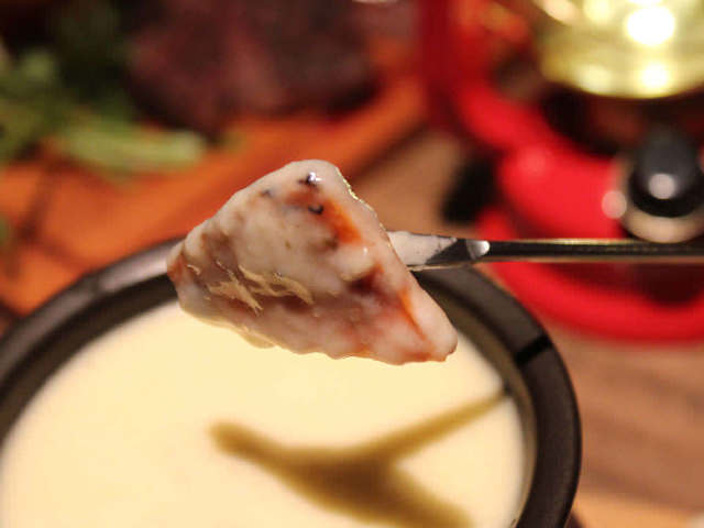 スライスしたチーズミックスに、生クリーム、白ワインを混ぜて作ったチーズフォンデュからはスモークの香りが。「こちらのチーズフォンデュにはスモークガンという、スモークの香りを注入できる器具を使って香りづけをしています」と行方さんは語る。