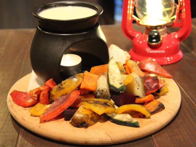薪火でざっくりと火を通したパプリカ、ビーツ、ニンジン、ズッキーニなどの国産野菜にチーズをたっぷりと絡めていただく。とろ~っとしたチーズにはほんのりと白ワインが効いていて、贅沢なほどのスモークの香りが。店の雰囲気もあいまって、本当にキャンプ場にいるみたいだ。