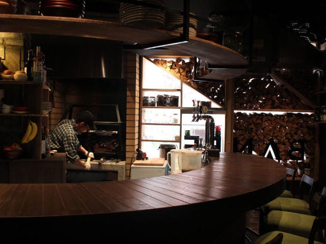 店に入ると、ウッディな香りはさらに強くなる。ビルの中のはずなのにいつのまにか避暑地のログハウスにトリップしてしまったようだ。厨房の中には薪火を使った調理器具が見える。
