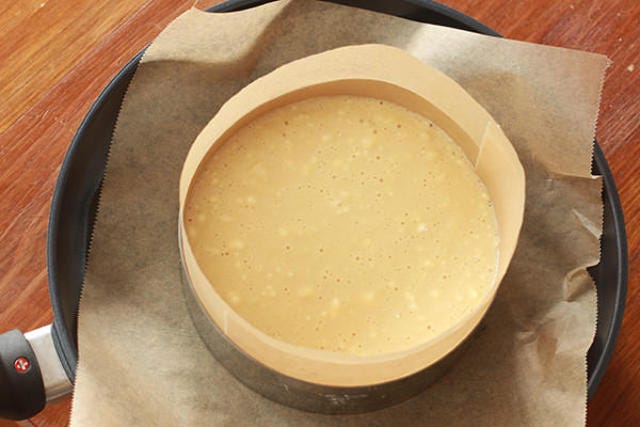②フライパンにクッキングシートを敷いて薄くサラダ油を引き、セルクル型をのせて側面にクッキングシートを敷いたら①を流し入れ、蓋をして弱火で15分加熱する。
