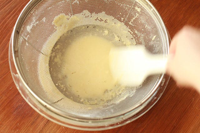 焼く前に生地を裏ごしをするとダマになりにくく、生地の表面が綺麗に焼きあがる。