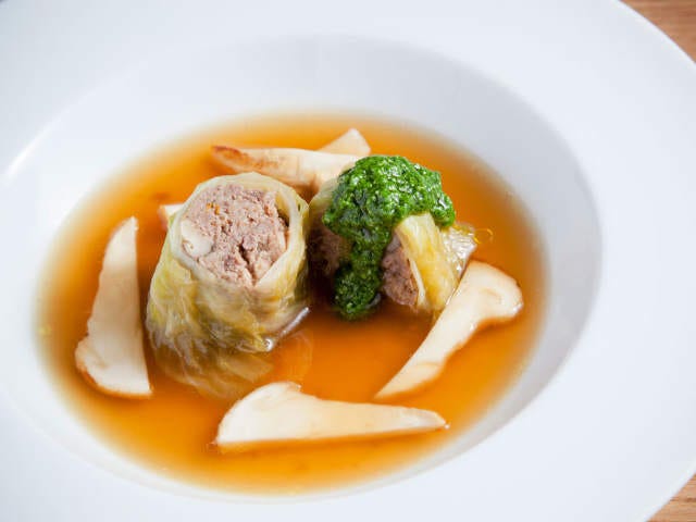 もはや家庭で食べることがほとんどの「ロールキャベツ」がいったいどう出されるのか興味津々。「このままだとレストランの料理ではないので土瓶蒸しをイメージしました。松茸とコンソメが相乗効果をもたらし、本当においしいスープになります」と言う古澤シェフ。
