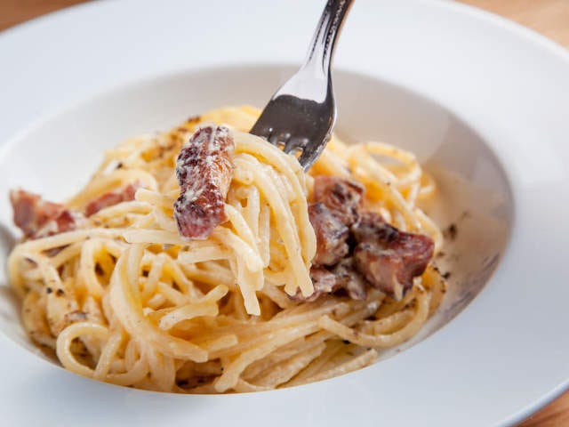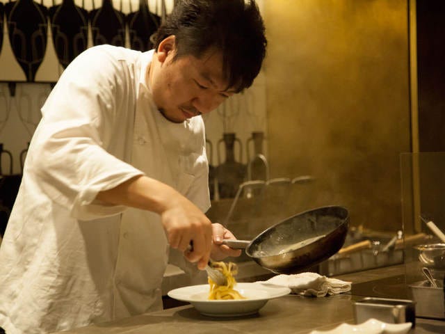 取材当日はカルボナーラをお願いした。はじめはさして感じなかったのだが半分くらい食べ進めたあたりから黒七味の威力が発揮されてきた! 黒コショウと比べると複雑な香りと風味がありまったく飽きさせない。じっくり炒めたパンチェッタはカリッとジューシー。良い塩加減になるよう大きさに気を遣うそうだ。イタリアンに和の要素を融合させるには「既成概念にとらわれないことが肝心」とシェフ。ただおいしいだけではなく驚きがあることで記憶に残る料理となる。
