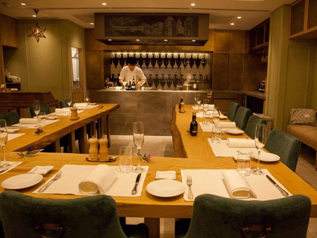 店名のとおりそこはまさに“アンテプリマのお家のキッチン”。コの字型の大きなテーブルの正面にはアイランドキッチンがあり、古澤正広シェフの料理する様を眺めていられる。近くの席ならばシェフとおしゃべりしながら料理を待つのも楽しい。奥にはソファ、壁の棚には荻野氏が自らイタリアから買い付けたワインやパスタなどの食材やアンティーク雑貨が並ぶ。