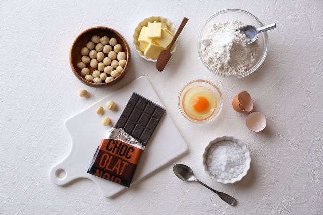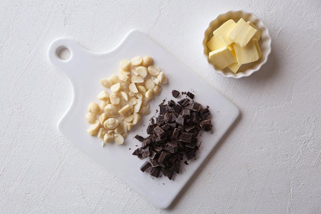 ① バターを常温にする。板チョコ、マカダミアナッツを粗めに砕く。