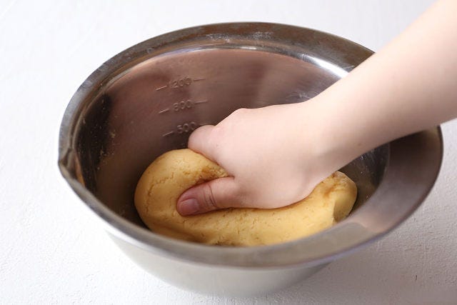 ③ 溶いた卵を少しずつ入れ、生地全体がなじむまで捏ねる。