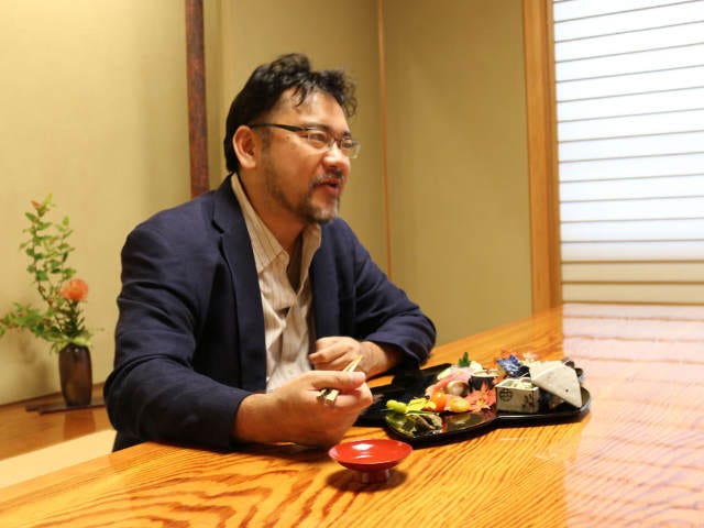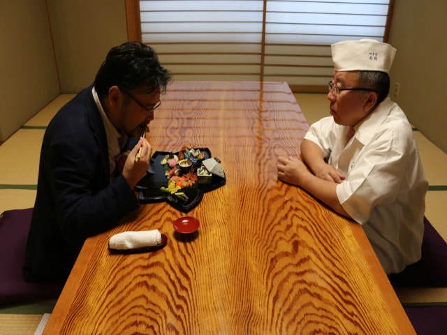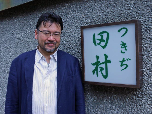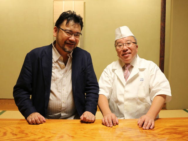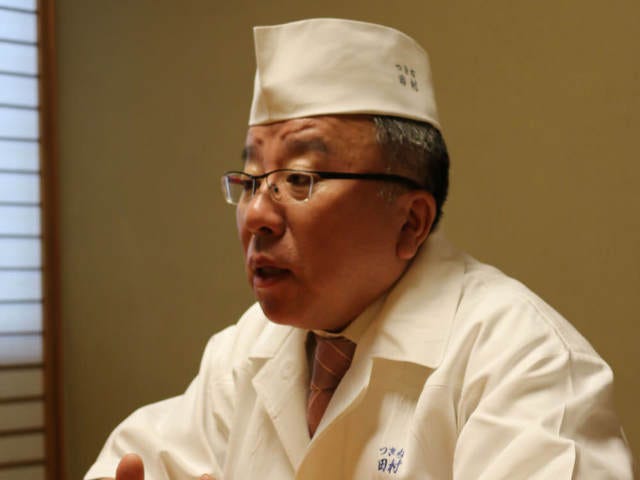 正面に『つきぢ田村』のご主人の田村隆さん、三代目だ。話は、なぜか娘さんの話になる。田村隆さんには三人の娘さんがいる。田村の「田」には「水」だということで三人とも名前に「さんずい」の字を入れたそうだ。「潤」「泳」「沙」の字がそれぞれ入っている。継いでもらおうとは思っていなかったけれど、長女の旦那さんがお店を継ぐらしい。もともとは料理とまったく縁のない仕事をしていたそうだが、「料理屋とは何ぞや」を知ってもらいたくて知人のお店にお願いして修業した。ちなみに、三人の娘さんはだしが離乳食だったそうだ。羨ましい離乳食だ。