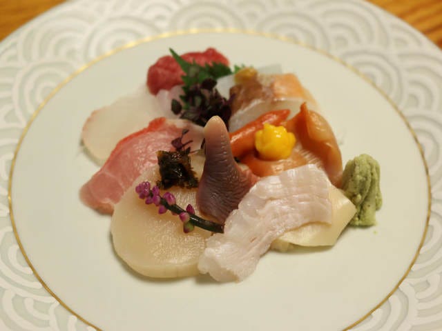 これまた高級なお刺身を、これまたかわいく少しずつ盛りつけたお皿だ。少しずついろんな種類を食べるのは実に贅沢だ。そもそも、お店が終わりそうな時間に入ったお客さん2人に一人前しか残ってない刺身を半分に分けて出したことから、この少量多種の皿が生まれたそうである。確かに、これは素敵だ。しかもお造りというより、今流行りのカラフルなケーキが乗った皿よりも彩りのある皿に仕上がっている。山葵好きの私にはちょこんとのった山葵がうれしい。山葵がうまい。