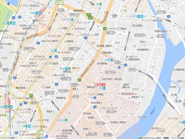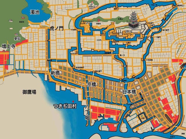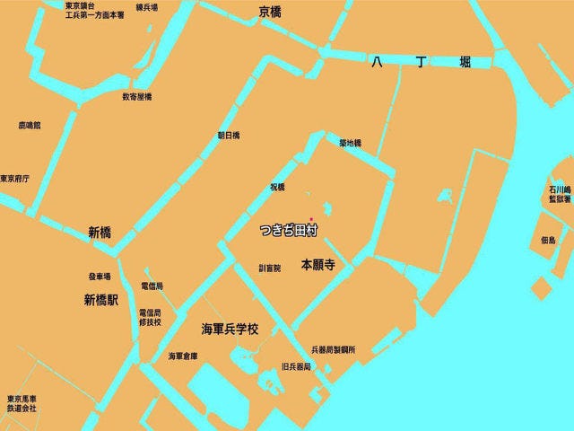 『つきぢ田村』の玄関の前の道を北西に行くと明治の地図で祝橋を渡ることになる。現在は川ではなく左手眼下に首都高速道路が見える。右手は公園だ。また、『つきぢ田村』の前から北西に行きすぐ角を右へ曲がり北東に歩くと築地橋を渡ることになる。ここも現在は首都高速道路の新富町出口が川のかわりに眼下に見える。ここらへんの首都高速道路は、川(堀)の水を出してそのまま道路を作っただけのように見えるし、実際そうだ。