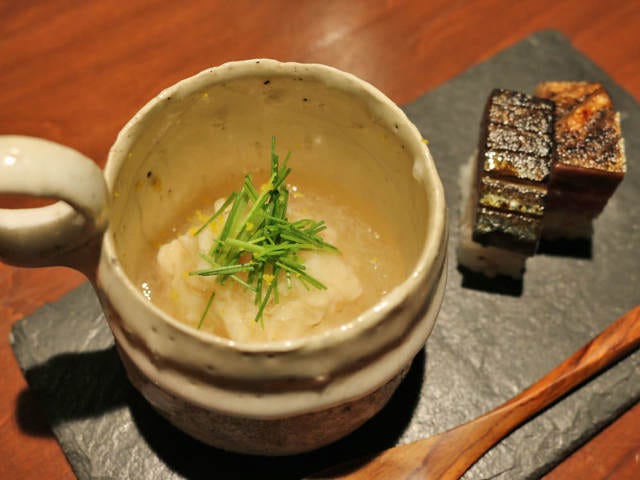 優しく締められた「鯖の棒寿司」は、鳴り止まないお腹を落ち着かせてくれる。ふたくちで食べ終わるのがもったいないほど濃厚で甘く、口に運ぶと芳ばしい香りが広がる。秋の夜長で冷えた身体を温めてくれる「蟹しんじょう」は癒しの一品。ぎっしりつまった蟹のうまみに柚子の香りが華やぐ。