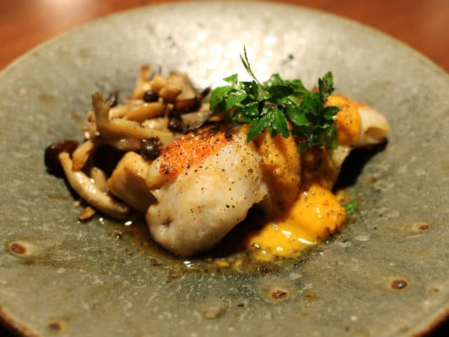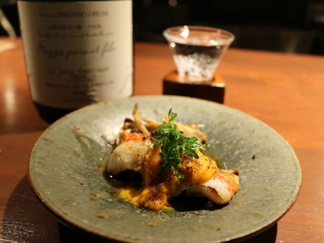 究極の贅沢から生まれた酒には、ちょっぴりリッチな肴と合わせたい。「金目鯛と雲丹の山椒醤油焼き」は山と海の香りを一緒に堪能できるフェロモン満載の一皿。オーブンで焼いたキノコから抽出されただしの上で、丁寧に火入れされた金目鯛が泳ぐ。箸を通すたびに少しずつ金目鯛の脂がだしに溶けて、甘みがどんどん増していく。ウニも混ざっていよいようまみが最も濃厚になった瞬間、お猪口を口へ運ぶとピリッと電気が走る。散りばめられた山椒の辛味と酸をしっかりと感じる「ソガ ペール エ フィス」との相性は完ぺきだ。濃厚なうまみをすっきりと仕上げてくれる尾を引かない後味に、大人の色気を感じさせられた。