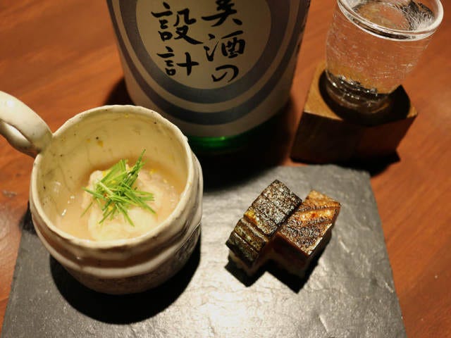 先付けに合わせて嗜む一杯目は、秋田県産の純米吟醸「美酒の設計」(齋彌酒造店)。滑らかな飲み口に、しっかりとした米のうまみが感じられるのは、山田錦の中でも等級が高い“特等”米100%で造られているから。その名の通り、計算し尽くされた「美酒の設計」は、角のない優しい印象で肩の力を抜いてくれる。肝心の一杯目にもってこいだ。
