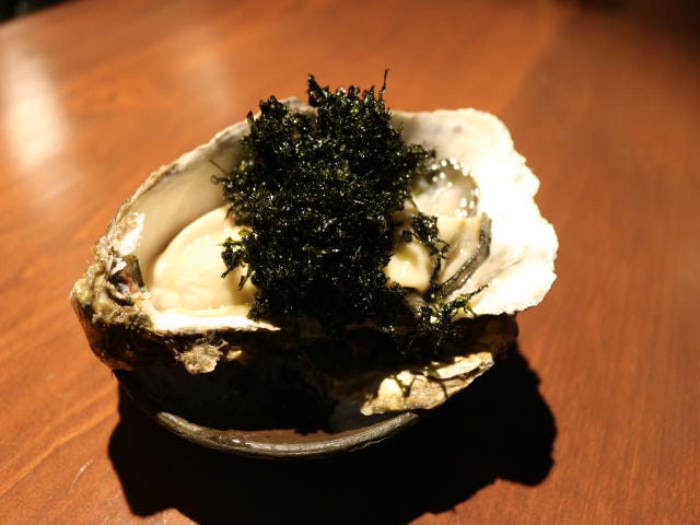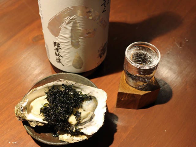 北海道仙鳳趾(せんぽうし)厚岸湾の牡蠣は、希少な酒に負けないほどの存在感ある一品だ。添えてある佐賀県有明海の干し海苔と一緒に食べると、ミルキーな牡蠣と海苔の食感が楽しい。そこでグラスをひと口。見事に濃厚さが増し、海の豊かな香りが口いっぱいに広がる。