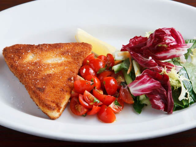 ミラノ風カツレツはミラノで修業していたシェフの得意料理。基本は豚を使うが、こちらはカジキマグロ。黄金色に揚げ焼きしたカツレツの衣はサクッとしてカリッ、身はジューシーでふんわり。豚だと叩いて5mmほどの薄さにするがメインだとちょっと物足りなさを感じてしまう。でもこれだとボリュームもあってヘルシー。カジキマグロの質が良いのでそのままで味わいは十分だ。