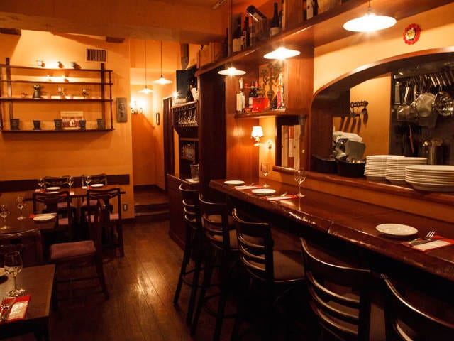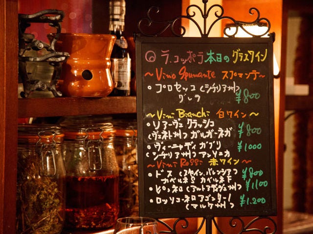 料理に寄り添うワインはイタリア全州から集められた。グラス700円〜、ボトルは3,800円〜、それぞれのブドウのおいしさを楽しんでもらいたいと、ブレンドではなく単一のブドウを使っているワインを揃えている。ワインとつまみを楽しみ、シメにパスタかメインを頼むのがベスト。その日の気分とお腹の具合に合わせて選べるのが嬉しい。