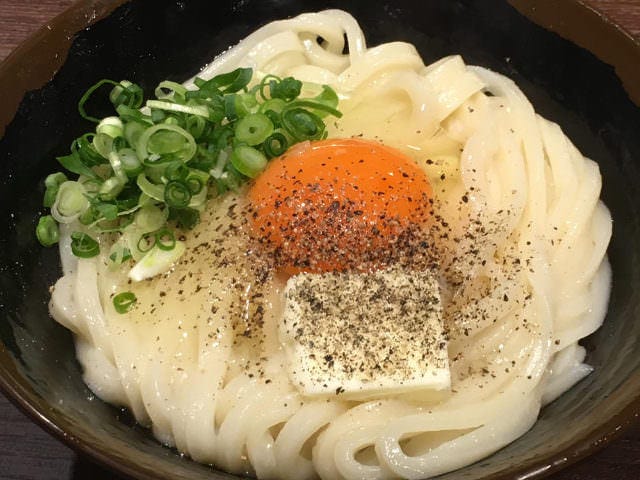 定番のかけうどんはもちろん、本店にはないメニュー「釜玉バター」もカルピスバターの濃厚な味わいが好評だ。