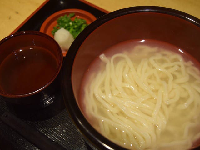 温かい、または冷たいうどんを選び、トッピングを選ぶシステム。基本300gの麺は増減可能で、減らすとワカメがサービスされる。麺が太いので一度に1、2本を箸で少しずつ口の中に送りこんでいただく。
