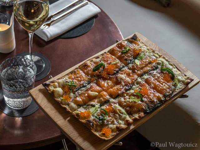 特に人気の高い料理は、バーのみで食べられるAlsatian Tarte Flambee(アルザス風タルト・フランベ)。アルザス地方の郷土料理で、薄いパン生地の上にチーズやベーコン、玉ねぎ、マッシュルーム、イクラなどがのっている。