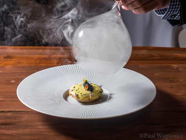 メインダイニングでは、Sturgeon & Sauerkraut Tart American caviar mousseline(チョウザメとシュークルートのタルト、ムースリーヌ、アメリカンキャビアのせ)の人気が高い。見た目もユニークだが、演出も凝っている。テーブルの上でウエイターがガラスのかぶせを持ち上げると、リンゴの木をいぶしたスモークがふわっとたちのぼるのだ。