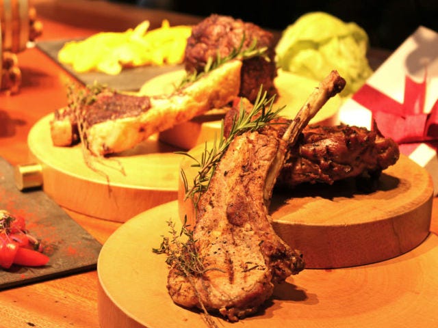 料理もアートな作品が食卓を彩る。たとえば前菜のサラダは「緑しかないサラダ」「黄しかないサラダ」「赤しかないサラダ」の個性派3種が揃う。一方、メインはキッチンの奥にある窯で焼かれた「窯焼き肉の盛り合わせ」(写真・下)がおすすめ。赤身の短角牛と霜降りの黒毛和牛を自家交配させた“短黒牛”や、日本生まれ日本育ち純血の仔羊といった希少肉が堪能できる。