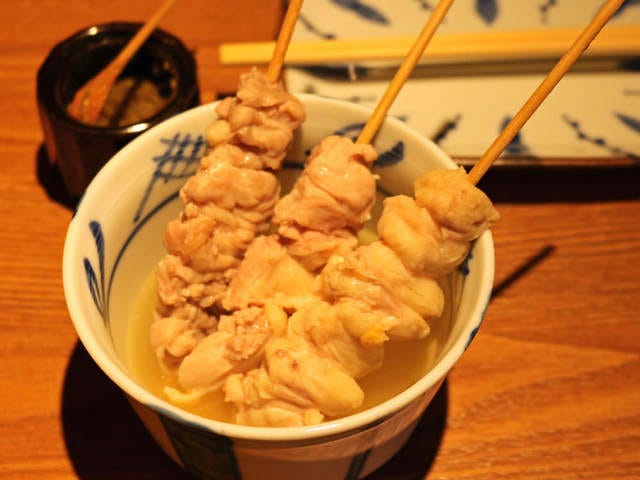定番の「大根」(写真・上)は直径10cm超のダイナミックなボリュームで280円とかなりリーズナブル。店長の小川陽さん一押し「名古屋コーチン半熟卵」や、トロトロに煮込まれた「せせり」(写真・下)、ジューシーな鶏のうまみを感じる「もも」(同)、肉の甘み溢れる「ぼんじり」(同)といった鶏串も、ここでしか食べられない一品だから酒の肴として外せない。