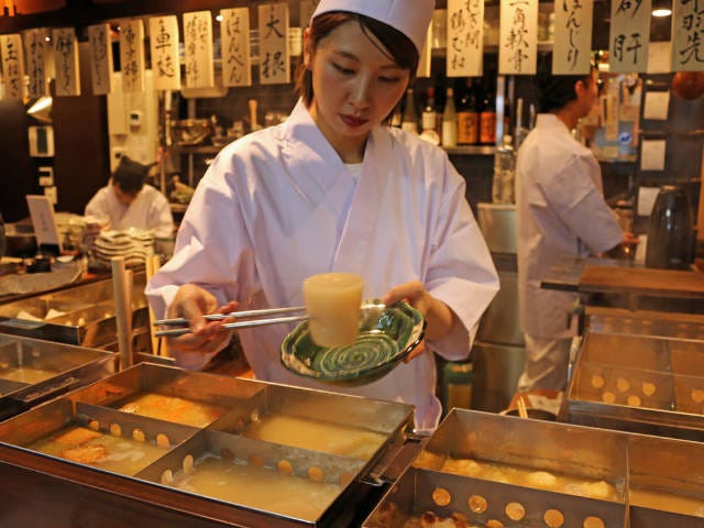 関東初出店が話題になっている『鶏だしおでん さもん』は、名古屋で大人気のおでん屋だ。京都の町家をイメージした和の趣がある佇まいの真ん中で、ひと際目立っているのが大きなおでん鍋。その鍋から漂うだし香に鼻をくすぐられ、思わずのれんをくぐってしまう。