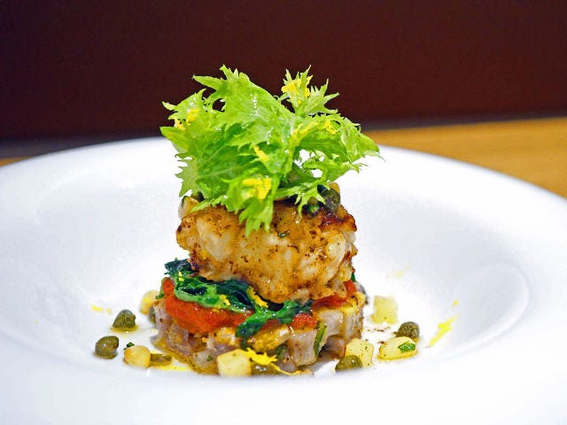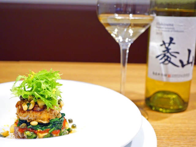 こうした和の食材をふんだんに使った前菜には、日本ワインをマリアージュ。山梨県勝沼で作られた「菱山 2013 鳥居平今村」は、甲州ブドウ100%のワインである。勝沼ぶどう郷駅からすぐのところにある菱山の畑は、寒暖差がしっかりしていて水はけがよい。トマトソースの酸味とバターの甘みは、ワインと一緒に味わうことでまろやかに演出される。「黄柚子で香り付けされた料理には、柚子フレーバーを感じる甲州ブドウを合わせました」と、ペアリングを提案してくれるのはワインディレクターの田辺公一さん。もともと『ラス』のシェフ・ソムリエだった田辺さんによる組み合わせは食材同士の香り、産地などユニークなペアリングが体験できる。
