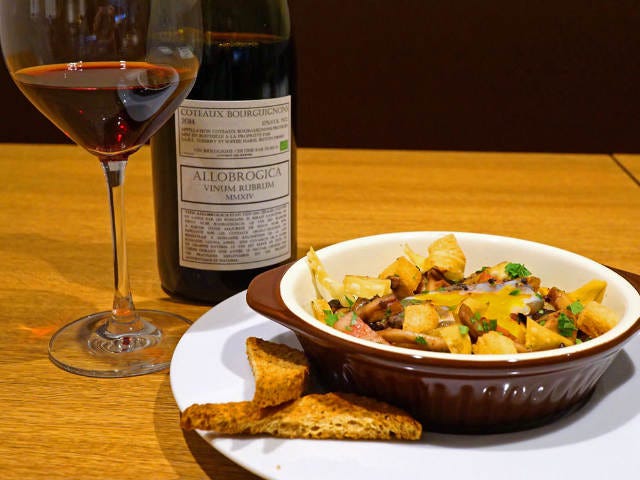 このブルゴーニュの郷土料理に合わせるのは、もちろんブルゴーニュワイン。「コトーブルギニョン・アロブロジカ 2014(ドメーヌ・デュ・ビュイロン)」は、ピノノワール種に1割ほどのガメイ種が入っている。「アロブロジカは、昔、ピノノワールの名前だったんです。ボージョレ・ヌーヴォーで有名なリヨン地域が原産のガメイ種は、ハム料理が多く食べられる街でもあり、ベーコンとよく合います。素朴で近寄りやすさを感じるガメイ種は、いい意味で田舎っぽく、ナチュラルワインの土っぽさは木の子と相性がいい。そこに、エレガントなピノノワール種が混ざることで、レストランらしさを演出してくれます。料理の工程すべてに赤ワインを使用しているからこそ、ワインが料理と一体化し喧嘩することなくマリアージュを楽しめます」と田辺さん。なるほど、理にかなったペアリングだ。
