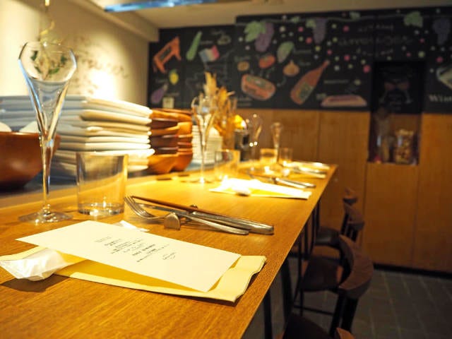 “ブション”とはフランス語で居酒屋。「そう名乗る業態は、まだ日本では数えるほどしかありません。表参道というハイクラスなレストランが多い場所で、『アミュゼ』はビストロよりも気軽に、日常使いできる店を目指しました」と店長の真鍋ゆう子さんは話してくれる。「居酒屋」と聞くと雑多な店を想像するかもしれないが、ここは正真正銘のフレンチレストラン。入店すると、洗練された空間が広がっている。