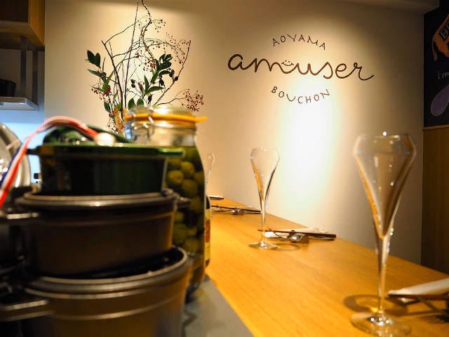 「フレンチスタイルの食堂」を謳う『aoyama bouchon amuser(青山ブション アミュゼ)』が9月23日、表参道にオープンした。骨董通りから裏路地に一歩入ったところ、『amuser』と書かれた看板の愛らしいスマイルマークに出迎えられて階段を上ると、正面奥にひっそりと佇んでいる。