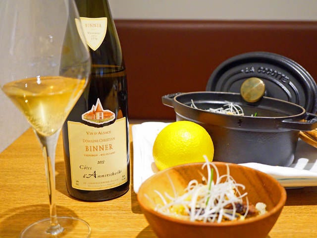 そのワインが「コート ダムルシュヴィール2012」。こちらは酸味と甘みのバランスが面白い完全ビオワインだ。アルザス地方でよく食される鴨肉やフォアグラは、オレンジの香りがするブドウ品種ピノグリ種とよく合う。リースリング種も入っているため、軽やかな中に少しコクを感じる。このワインとオレンジご飯でペアリング。丁寧に火入れされたフォワグラと、ジューシーなモモ肉の脂身は、オレンジの酸味と相性がよい。この組み合わせがディナーの最後を華やかに演出してくれる。