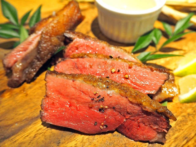「お待たせしました! 」とテーブルに運ばれた瞬間、思わず唾をのみこんでしまうのがメイン料理。それが、いかにもおいしそうな薫香を放ちながら登場した肉料理「青森県産 銀の鴨の藁焼き」。青森県の専門農場で厳選した飼料のもと飼育されたバルバリー種の鴨。そこで日本一とも言われるエトフェ(血を全身にいきわたらせる屠殺法)を施され、さらに熟成期間を経てジューシーさと柔らかさの増した肉質のムネ肉に藁の香りをまとわせた。