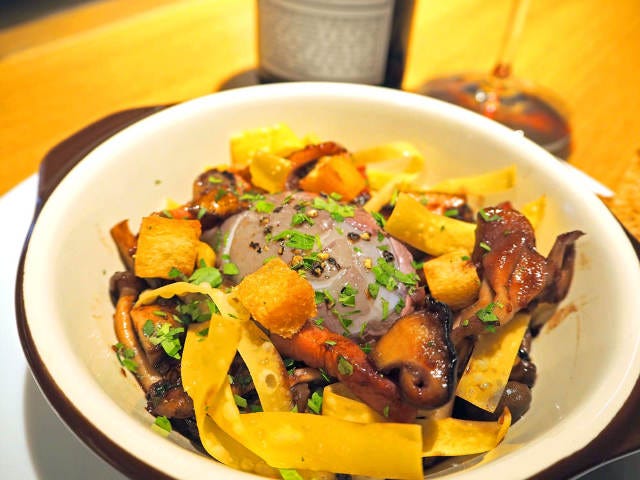 もう一つは温かい前菜「ウッフ・アン・ムーレット」(写真・上)。こちらはブルゴーニュの郷土料理をアレンジしたもので、うす紫に色づく温泉卵は赤ワインで煮たもの。ソテーした木の子も赤ワインで煮込むことでうまみを凝縮している。トロトロの卵をたっぷり絡めて食べると濃厚な味わいに。気づけばグラスに手が伸びる。