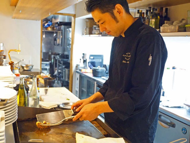 『アミュゼ』を切り盛りする前田高雄シェフは、実は、進藤シェフと同様、『ラトリエ ドゥ ジョエル・ロブション』出身。同級生の2人だが師弟関係として働く一方、何でも話せる親友だったという。明るく優しい前田シェフはムードメーカー的な存在だ。カウンター越しにお客と冗談を言い合えるのも、ブションならではの光景。名物大将のいる居酒屋のように、居心地がよくてつい長居したくなる。さらに、真鍋さんの気遣い溢れるおもてなしによって、『アミュゼ』は完成する。「ワインのつまみは500円前後からご用意しております。グラスシャンパーニュ、グラスワインは全て1,000円。サービス料はいただきません」。なんて太っ腹! 一度でも体験すれば、お洒落な行きつけの店にしたくなるはずだ。