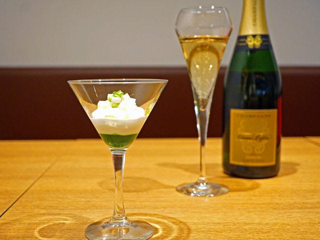 『アミュゼ』の「料理とワインのマリアージュコース」は、“1万円でお釣りがくる”というプライシングだ。一体どんなマリアージュが体験できるのだろうか。早速、紹介しよう。まずは、鮮やかな緑色と純白が美しいウェルカムアミューズの「あやめ蕪のムース」(写真・下)。さっぱりとしたあやめ蕪の葉をピューレ状にして下に敷き、小ぶりの蕪のムースを乗せた一品だ。上に飾られたフレッシュな蕪は、濃厚なムースと混ざって甘みが弾ける。