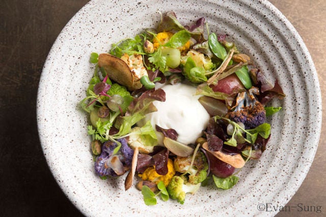 私はカリフラワーの料理をトライしてみたが、これもとっても美しくて美味しかった。パープルのカリフラワーと共にさまざまな野菜がセンスよく盛り付けられ、真ん中におかれたブルーチーズのソースをつけながらいただく料理だ。
