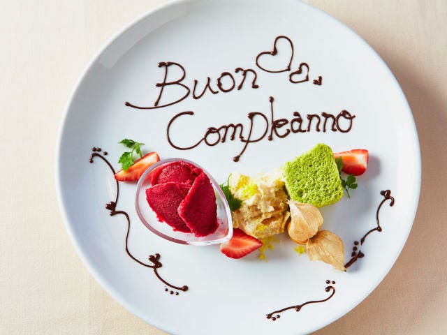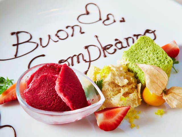 色鮮やかなデザートが運ばれてきた。お祝いや記念日など、お願いすればこのようにプレートに文字を描いてくれる。まずはシフォンケーキをひと口。くせになりそうな絶妙な甘さと香り…、なんとセロリなのだ。野菜のケーキって健康重視なものになりがちなのだが、これは本当においしい。セロリの香りはするにはするが甘さもあるのであまり気にならないはず。しかも使っているのは捨てられてしまうことが多い葉の部分。新鮮なうちにペースト状にして生地に練り込む。あますところなく使う、野菜が大好きなシェフならではの素敵なアイディアではないか。